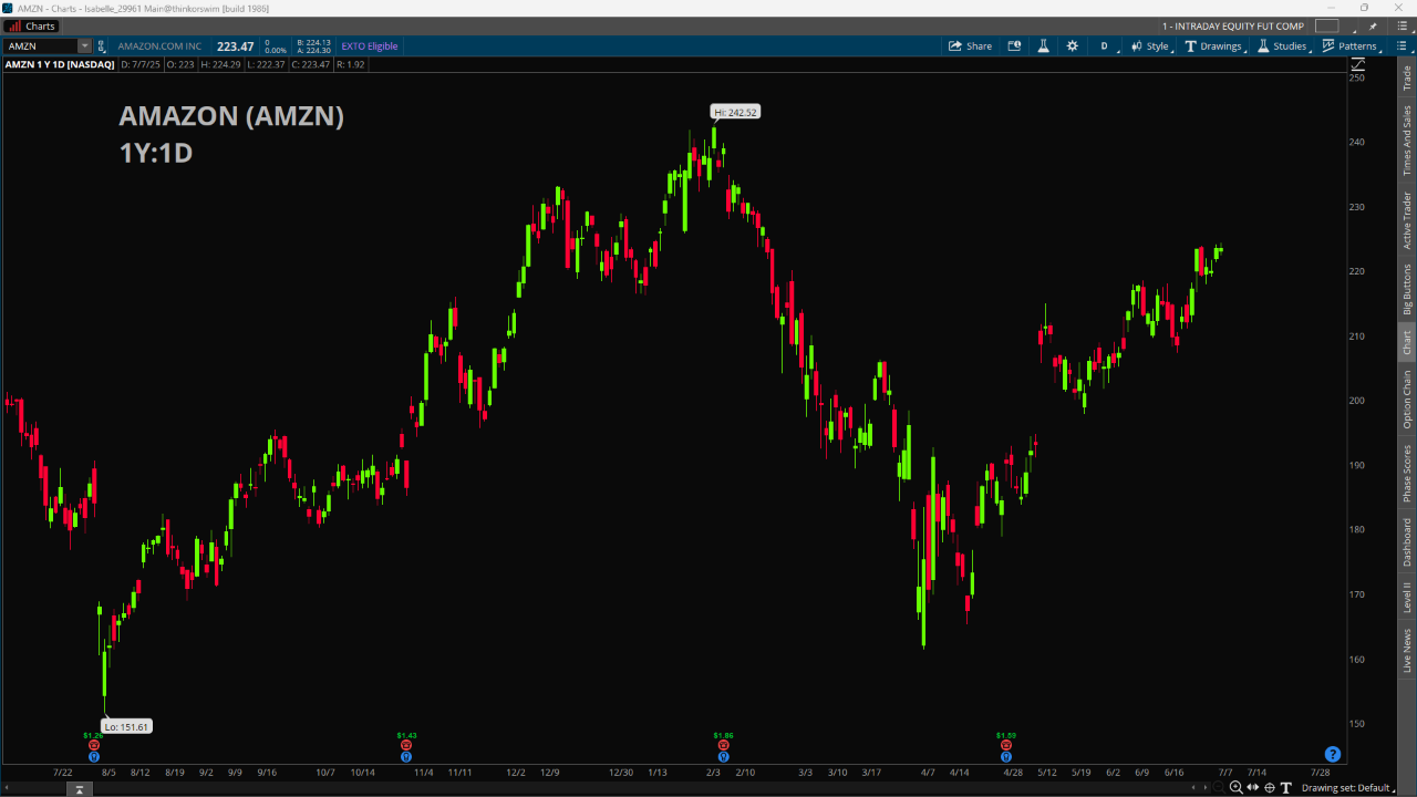 Amazon Chief Executive Andy Jassy stated last week that he expects shoppers will be excited about the longer discount window, "especially at this time, where people are still a little worried about what's going to happen with trade and continuing to have lower prices." Will discounts or potential tariff implications eat into the margins on sales? Adding two days to a historically banner sales record may provide even more optimism for investors in Amazon, especially when markets are near all-time highs. Amazon is not immune from market forces, but some traders may feel good data may provide the lift for shares to re-capture those all-time highs.