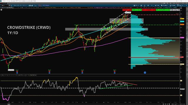 Today’s premarket drop also points to price falling below the yearly Linear Regression Line, which is a line of best fit based on closing prices. The LRL closed near 475 on Friday, and now marks another potential resistance hurdle for price. For possible support, look to another confluence near the 455 level. This represents the old highs from February as well as the 63-day EMA. Volume also starts to drop off below the 460 level according to the yearly Volume Profile study, with the next spike in trading activity centered around the 430 level.