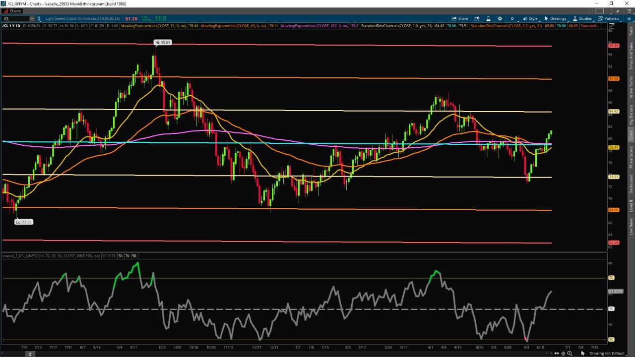 The technical picture seems to be improving for the bulls in the /CL contract. Several major moving averages, such as the 21-day, 63-day, and 252-day Exponential Moving Averages, were clustered together roughly around the 78-79 area. This type of confluence suggests weak overall trend direction, but price has now closed above all three of these moving averages and is continuing to move higher. The moving averages themselves also are sloping upward now, which is another bullish sign.