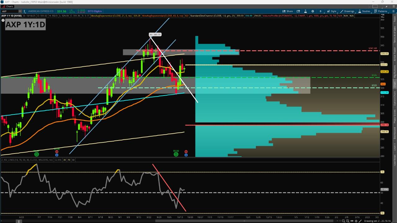 American Express saw a +50% surge to the upside from the tariff news announcement lows in April, recently notching all-time highs of 349.19. The Street is looking for earnings of $3.96 vs. $3.49 the previous year (+13.4%), and for revenue to come in at $17.99B against last year’s figure of $16.64B (+8.1%). Meanwhile, the Oct. 17 options expiration shows an expected move of about +/- $14.30 (4.3%).