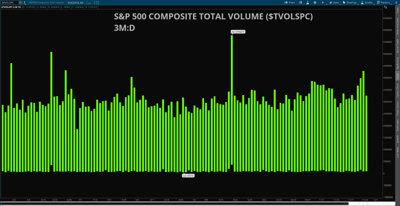 While some argue that this holiday week is producing “low-volume markets,” the data tells a different story. Volume in both the E-mini S&P 500 (/ES) and the SPDR S&P 500 ETF (SPY) remain near their 60-day volume averages. Moreover, market breadth strength is reflected in the S&P 500 Total Composite Volume ($TVOLSPC)—an aggregate of all component trading volume. Over the past three sessions, composite volume has increased and has now reached its highest level since June 27 (excluding the September quarterly options-expiration spike).