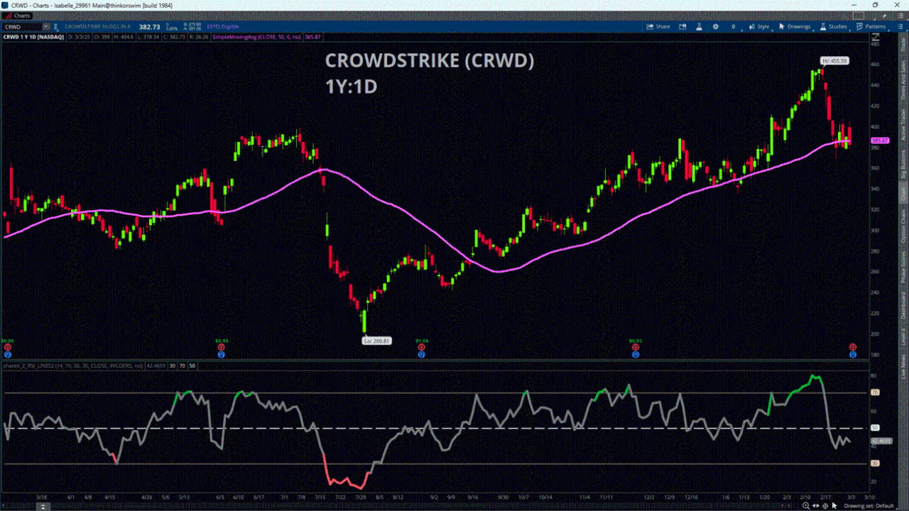 Cybersecurity company CrowdStrike (CRWD) reports earnings after the close today. This quarter, analysts are expecting CrowdStrike’s revenue to grow 22% year on year to $1.03 billion, slowing from the 32.6% increase it recorded in the same quarter last year. Adjusted earnings are expected to come in at $0.86 per share. Last quarter, the company beat on EPS and revenue, but the stock fell on softer full-year 2025 guidance. The stock recovered quickly and rose to all-time highs of $455 in mid-February. Remember last summer that the stock fell sharply after the company pushed out an update to their software that caused a massive outage, but the stock has recovered above those levels.