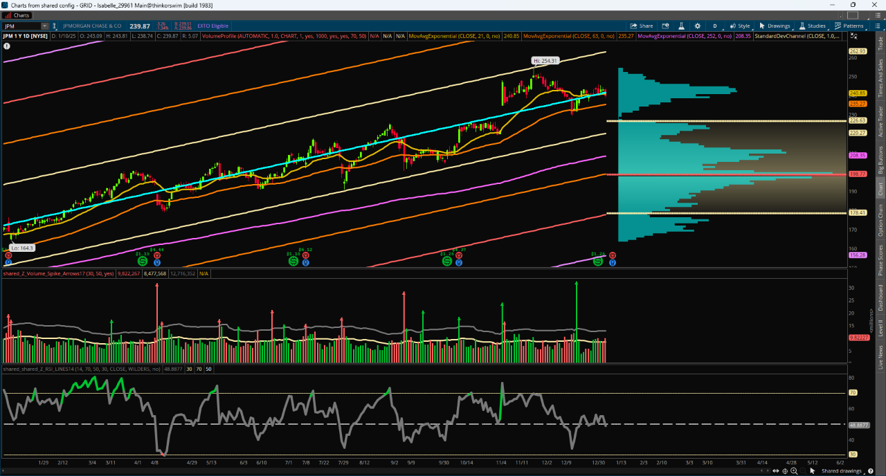Like many other stocks, JPM saw a sharp rally after the U.S. presidential election on Nov. 5 and surged about +11.6% in one day. Shares have mostly held on to those gains, and the yearly Volume Profile study reveals a notable volume spike of very heavy trading activity near the 243 level; this suggests greater conviction behind this move to the upside, and also gives traders a potentially important price level to monitor. Further examination of the financial giant’s technical picture shows another noteworthy confluence nearby. The 21-day Exponential Moving Average, the 50-day Simple Moving Average, and the yearly Linear Regression Line are all right around the 240 level, with the 63-day EMA just below at around 235.