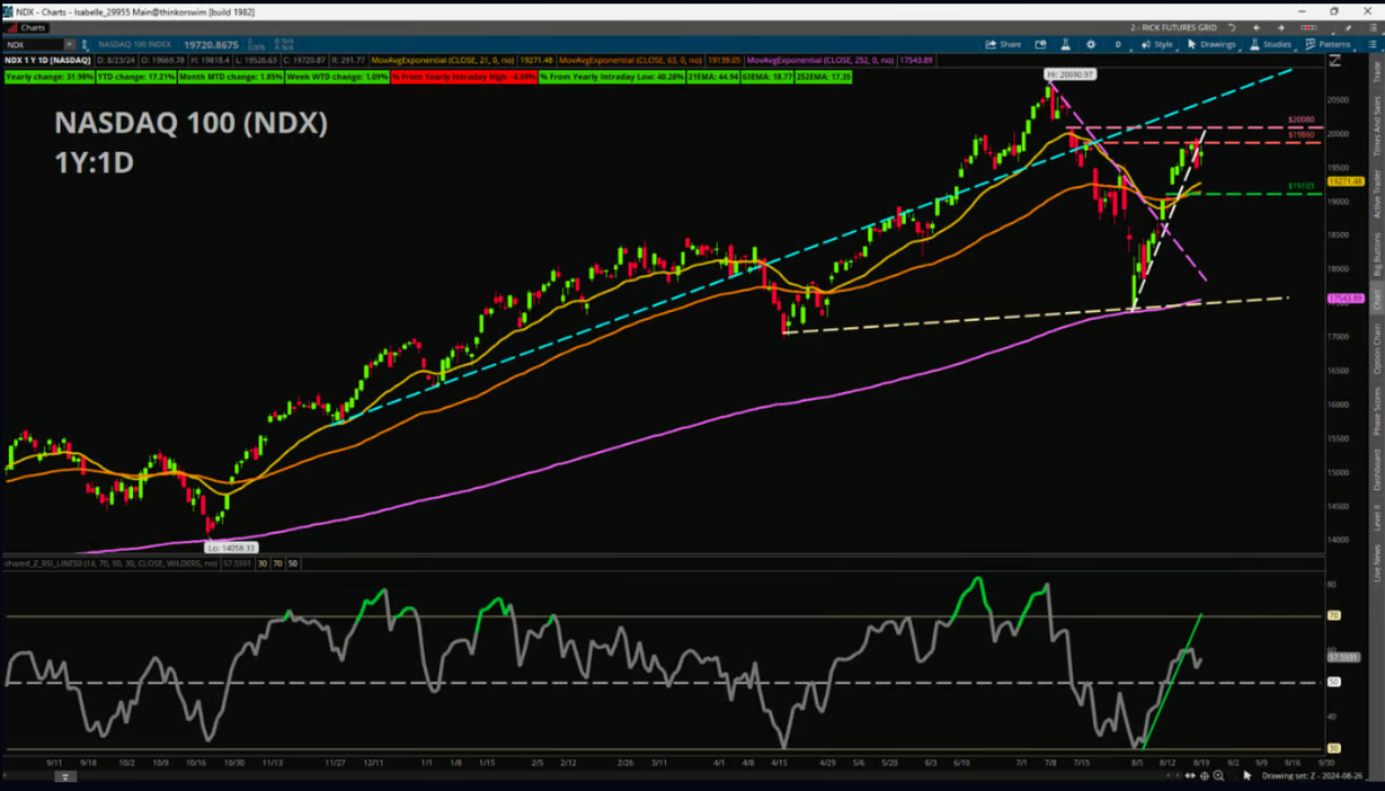 For support, one area that stands out is the confluence of the 63-day Exponential Moving Average with the pre-gap up high point on Aug. 14, which are near 19,139 and 19,103, respectively. For resistance, look to the recent highs near 19,860 and then the post-gap down high point of 20,080.