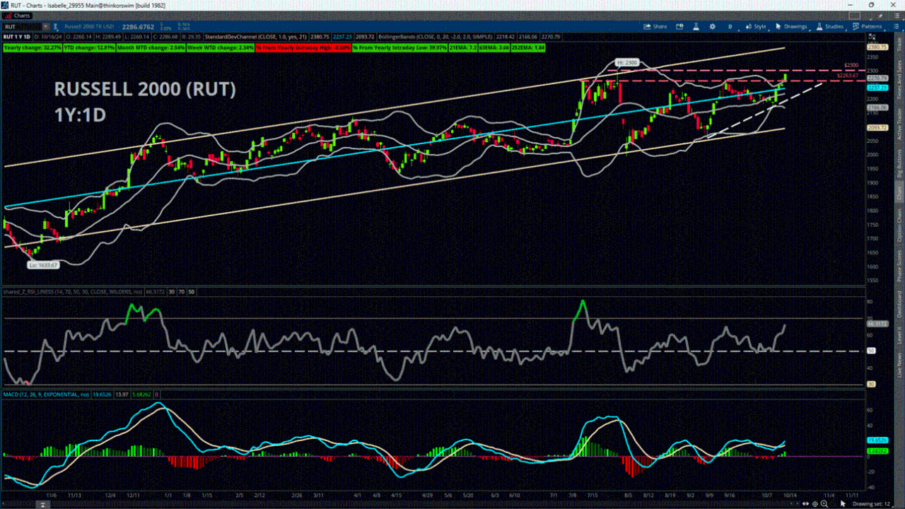 Several other signs of strength have recently developed. The RUT closed above its yearly Linear Regression Line (line of best fit based on closing prices) on Monday, which was around 2,233 at the time. Monday also brought a bullish crossover on the Moving Average Convergence Divergence (MACD), which measures momentum. Another commonly followed momentum indicator, the Relative Strength Index (RSI), also continues to make new relative highs along with price.