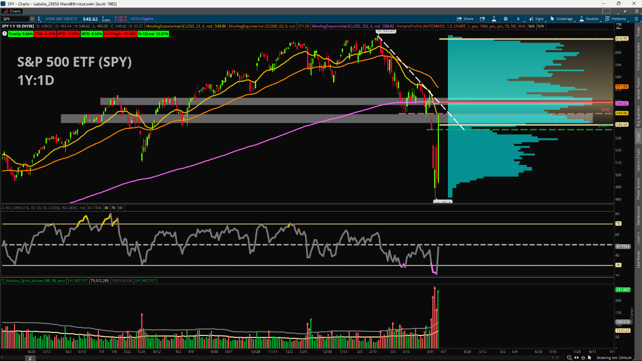 One crucial point to note as well is that the highs from yesterday came roughly back to a key resistance area, which is the old double-bottom lows near 550 on the SPY that price established last month, but the action did not break out to the upside. This is understandable given that there was already a very lengthy rally that took place, but this remains a key point to clear in order to establish potential trend shift. Going forward, the Volume Profile study shows heavy trading near the 540 and 560 levels, so these could be notable points to monitor for potential slowdown or consolidation in any further rallies.