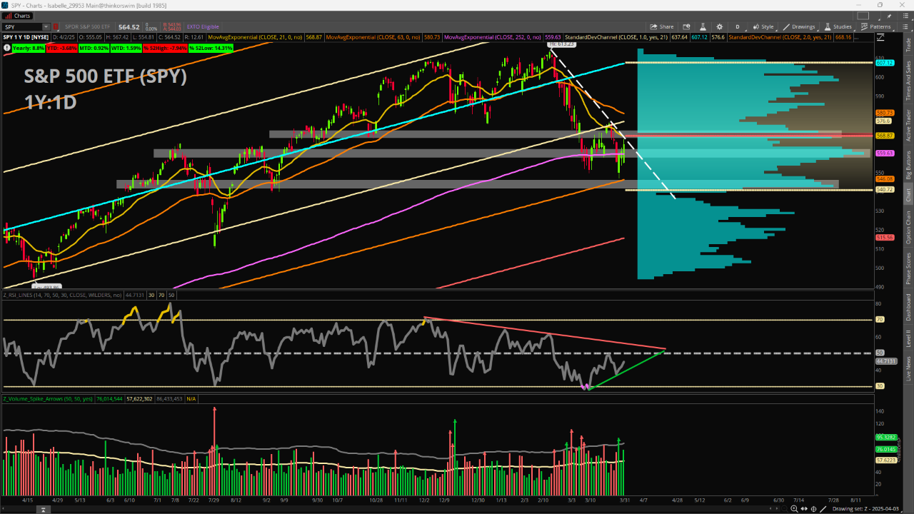 This area around 543 is in the thick of another volume node, and also roughly near the -2 Standard Deviation Channel. This is suggestive of a relatively extreme downside move and a possible supportive area around 546 based on yesterday’s close. Beyond that, watch for more old lows around 540 for a further foothold.