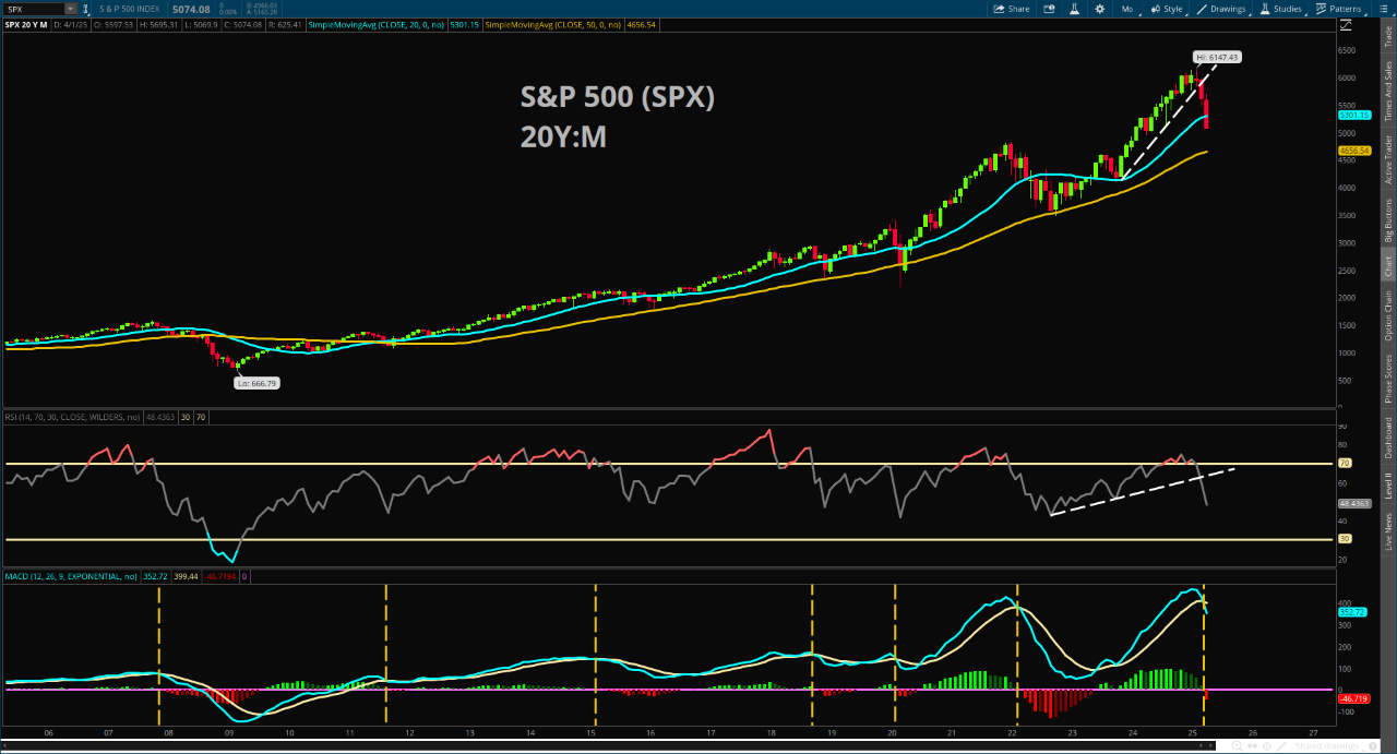 On the Schwab Network, we’ve been tracking the monthly chart for the S&P 500 (SPX) to identify key technical levels. One major area of focus has been the 50-month Simple Moving Average (SMA), which has historically served as strong support during corrections and bear markets over the past 20 years. As of last night, S&P 500 futures came within just 161 points of that crucial level.