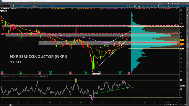 From a technical perspective, NXP has previously encountered resistance around the 237 area, most recently on July 10 as price reached the upper boundary of a rising wedge-type shape before retreating back to prior support near 220. A volume node near 235 also could present a potential slowdown area. Beyond that, 255 marks a repeated highwater mark the bulls have been unable to break. To the downside, several major moving averages, such as the 21-day, 63-day, and 252-day Exponential Moving Averages, are clustering together between about 212 to 222. This area also includes the yearly Volume Profile Point of Control at about 216, so this could be a notable supportive zone.