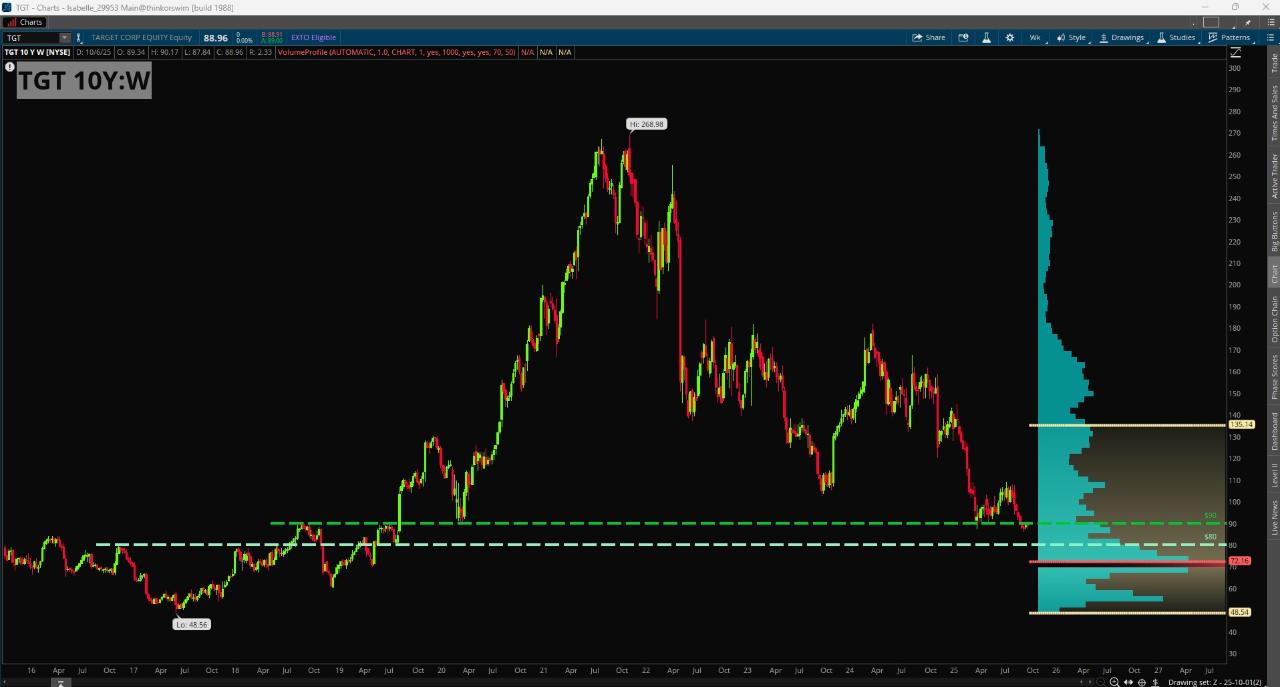 Target shares have struggled during the past year, with the stock down about -45% from its 52-week high of 161.50. Price has been largely sideways for about seven months, traveling in a relatively wide range between about 86 to 107. Traders find themselves facing price action that recently made new 52-week lows of 86.30, but for the most part held on around this supportive area that dates back to the old lows that were established at similar levels after the tariff announcement news shock even in April.