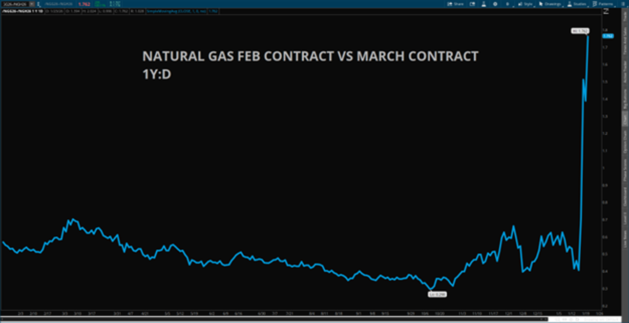 This abnormal spread reflects near-term event risk, specifically weather risk, being priced into the market, rather than longer-term demand expectations. Typically, as contracts approach expiration, front-month prices converge toward the next month’s price. Wide spreads like this rarely persist for long.